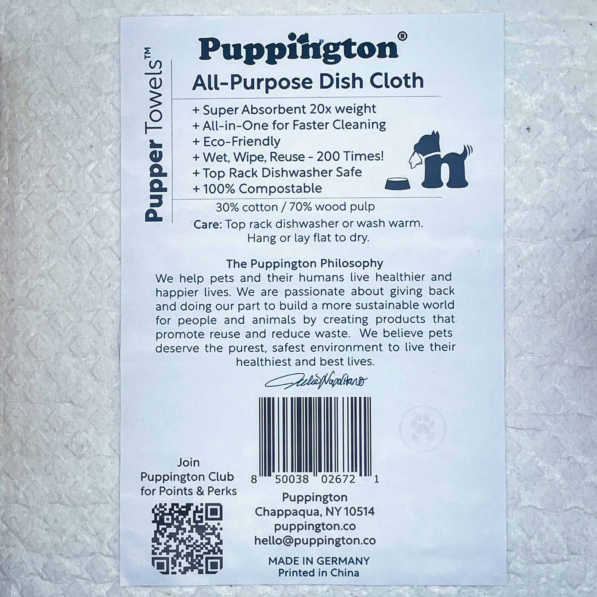 Each absorbs 20 times their weight & can be re-used for months. Wash in the dishwasher or gentle wash cycle and re-use up to 200 times. Designed with love by a New York dog mom, made from sustainable German cotton and wood pulp, these all-natural dish cloths are 100% compostable.