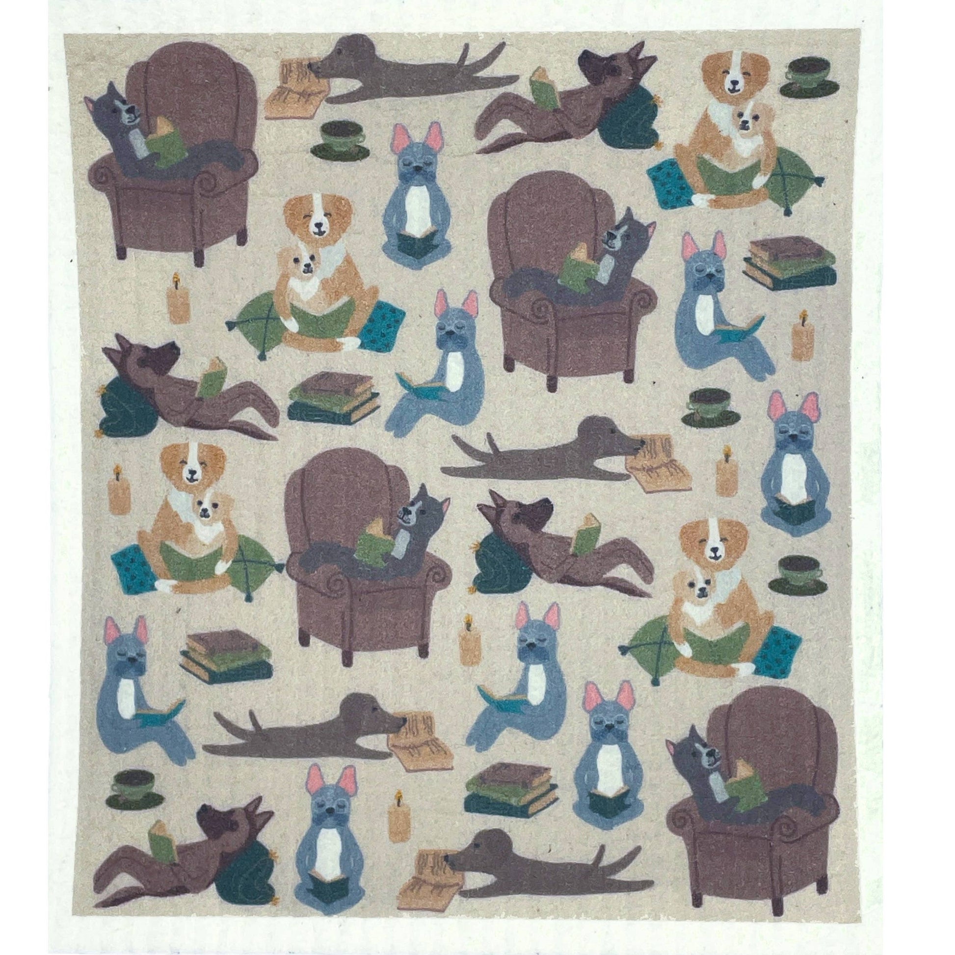 Bookish pups reading dog themed dishcloths by Puppington are the cutest sustainable dish cloths for dog lovers & bookworms!