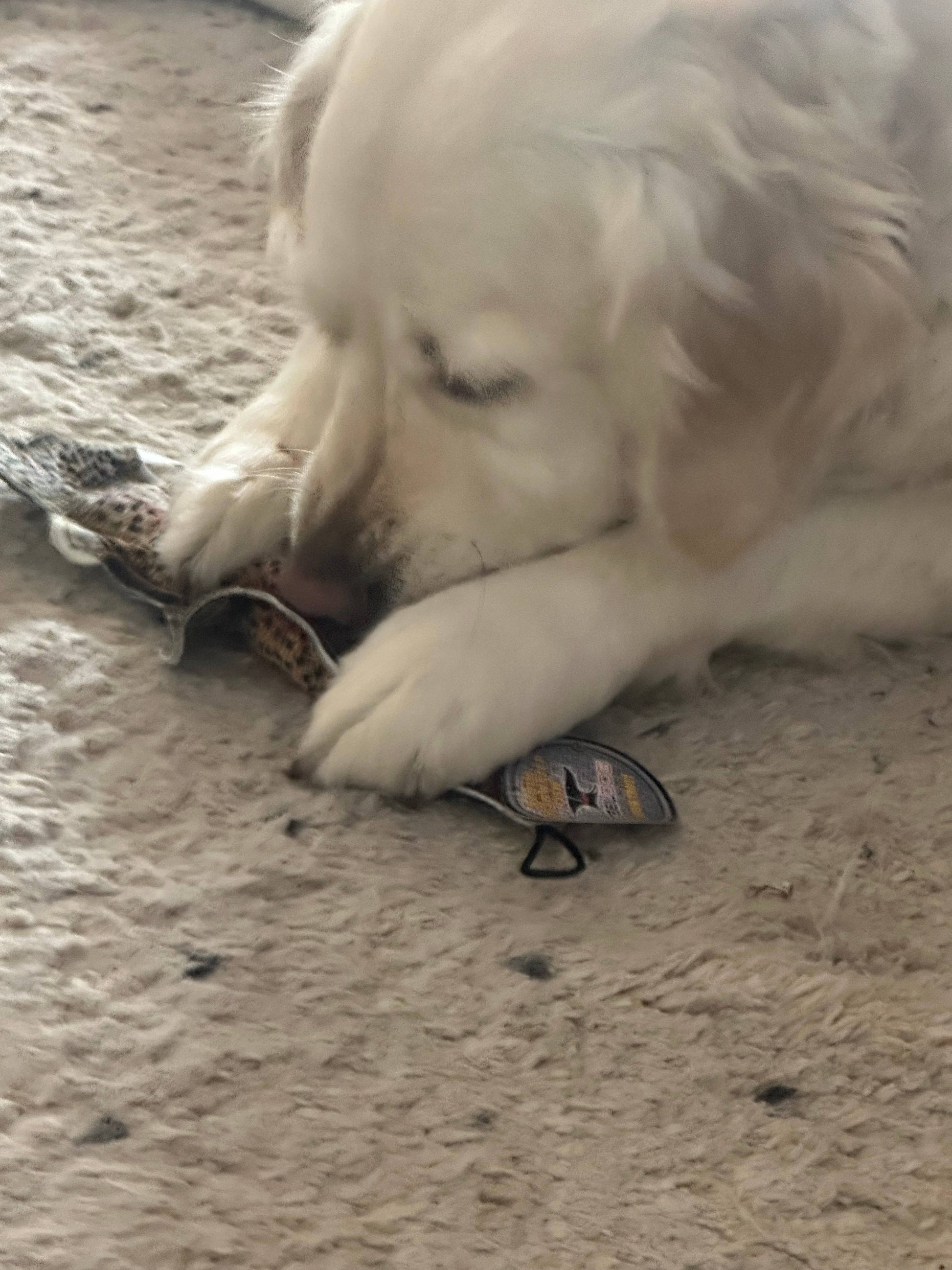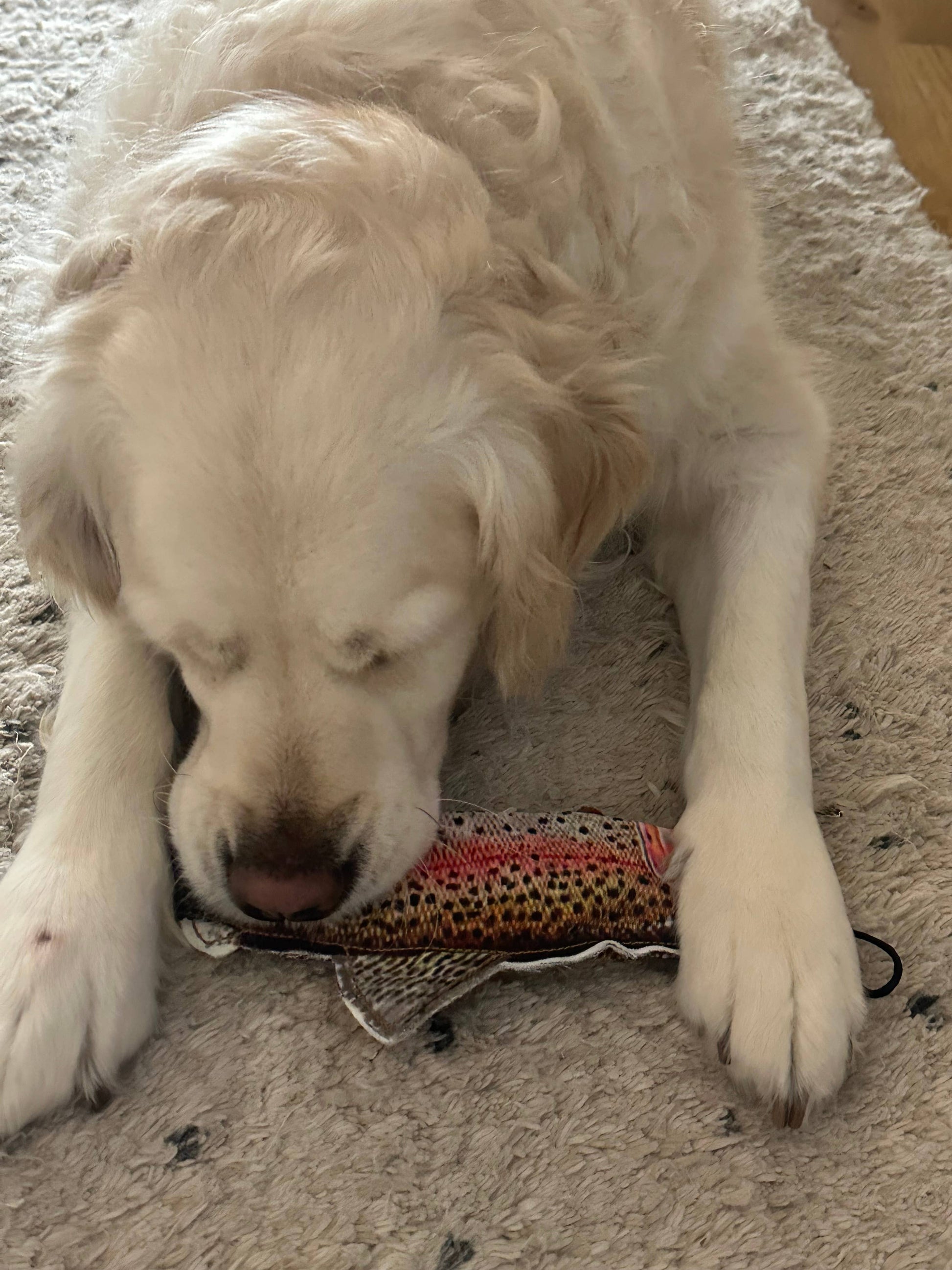 With a realistic print and durable body with rope inside, this Denim Rainbow Trout will be your dog’s second favorite fishing buddy. Inside includes a squeaker, but no stuffing for less of a mess. Denim Fish have a Tough Chew-o-Meter rating. Even if they do make it through the seams, another toy is ready to play!