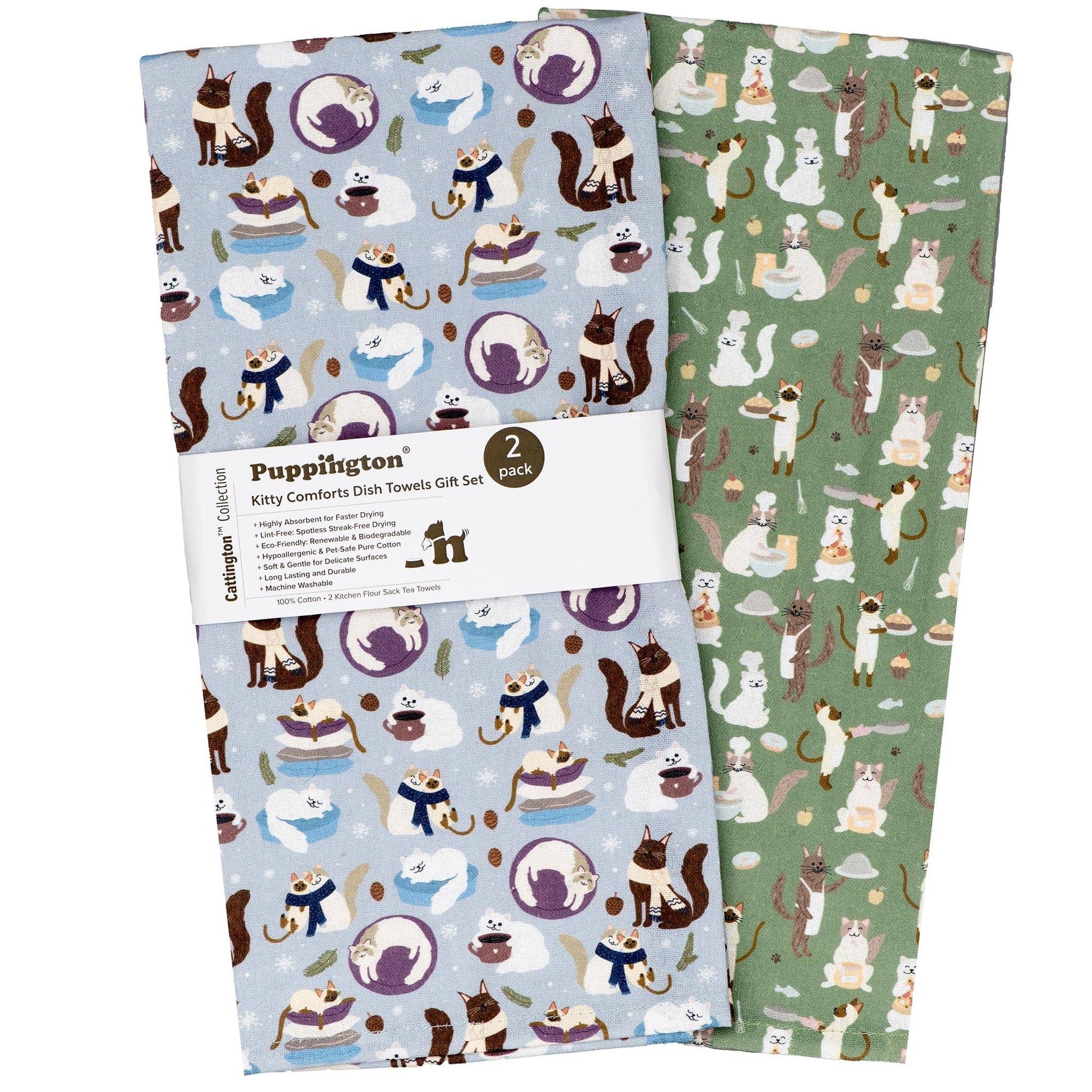 Introducing our festive Cattington Collection Kitchen Towel Gift Set 2-Pack, featuring adorable cats and kittens snuggling up in sweater weather and becoming the cutest chefs in the kitchen! These charming dish towels are not only a delightful addition to the kitchen and also offer a range of features that make them a must-have for every cat-loving home.