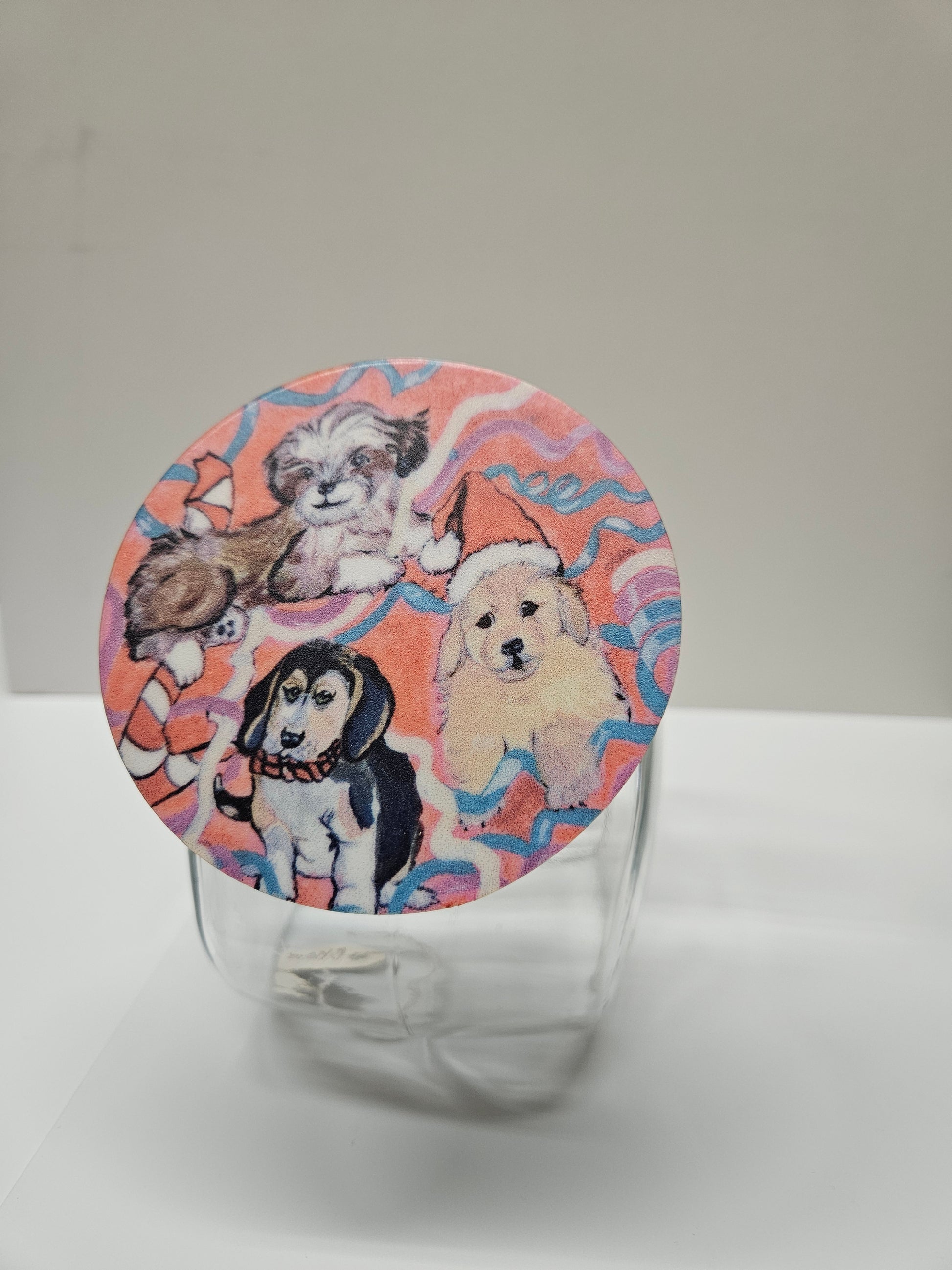 Small Decorative glass treat jar featuring 3 dogs celebrating the holidays