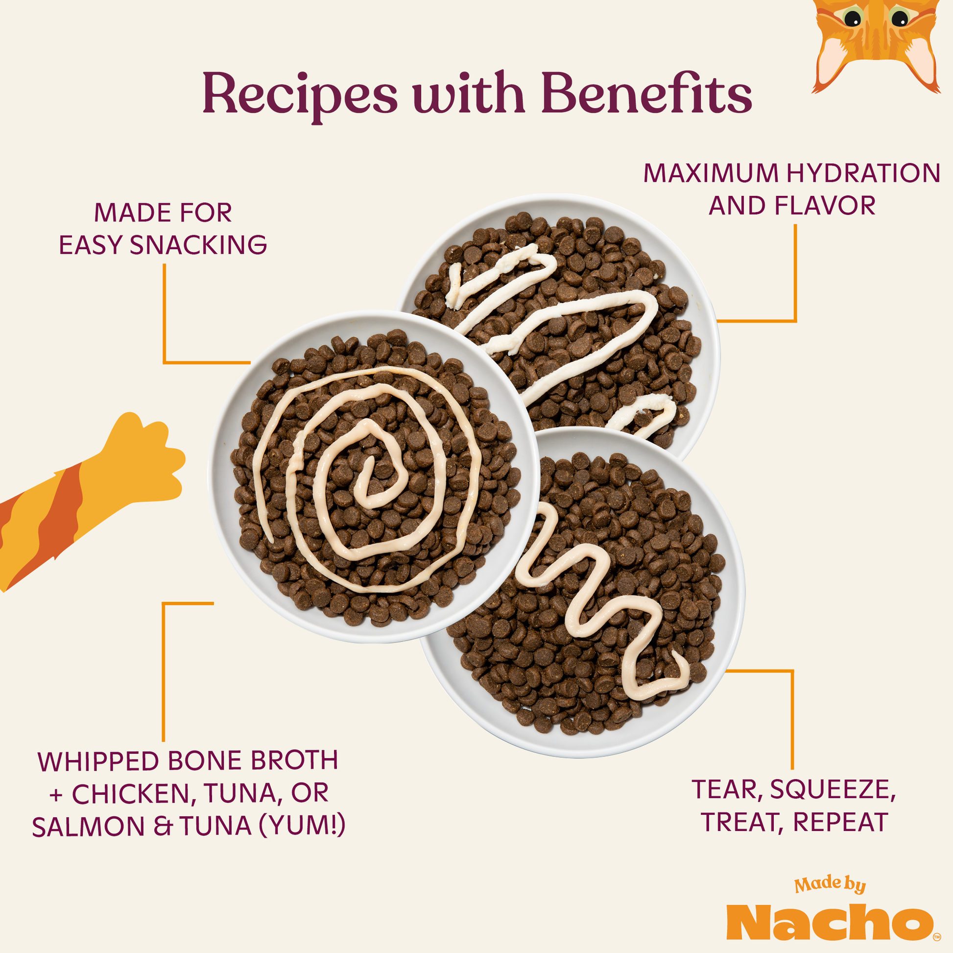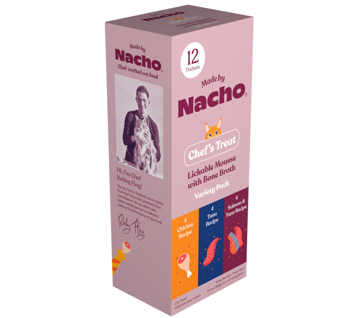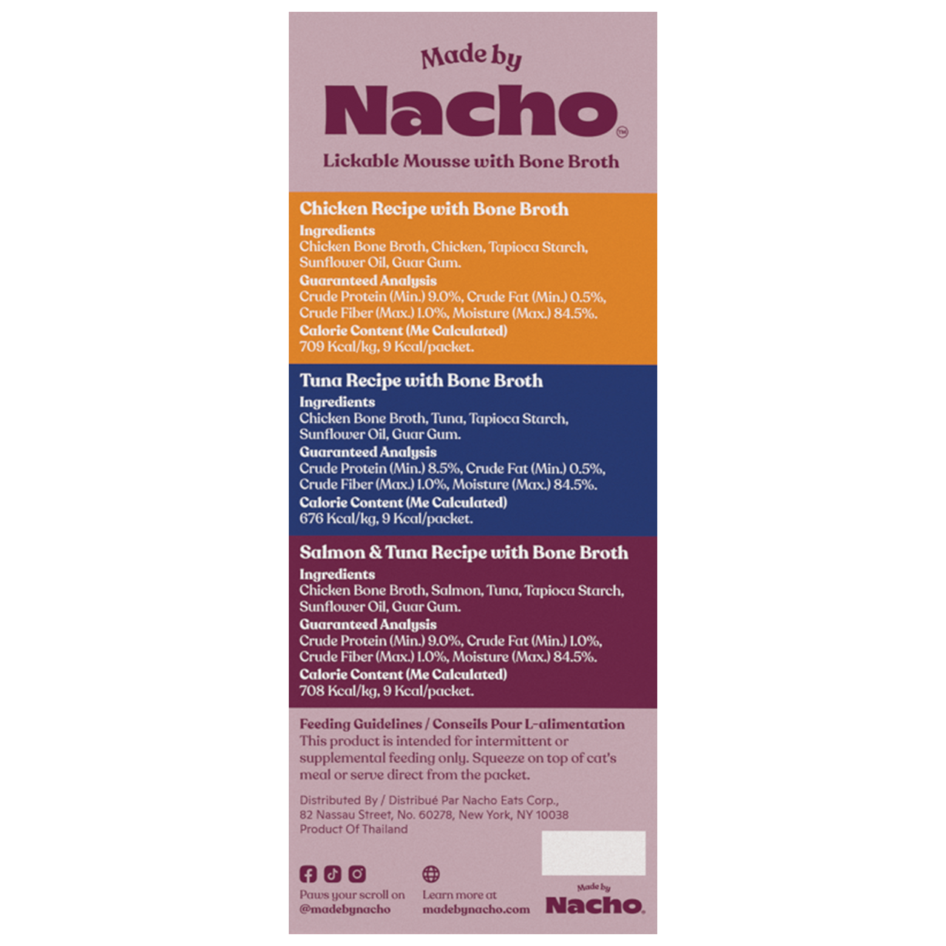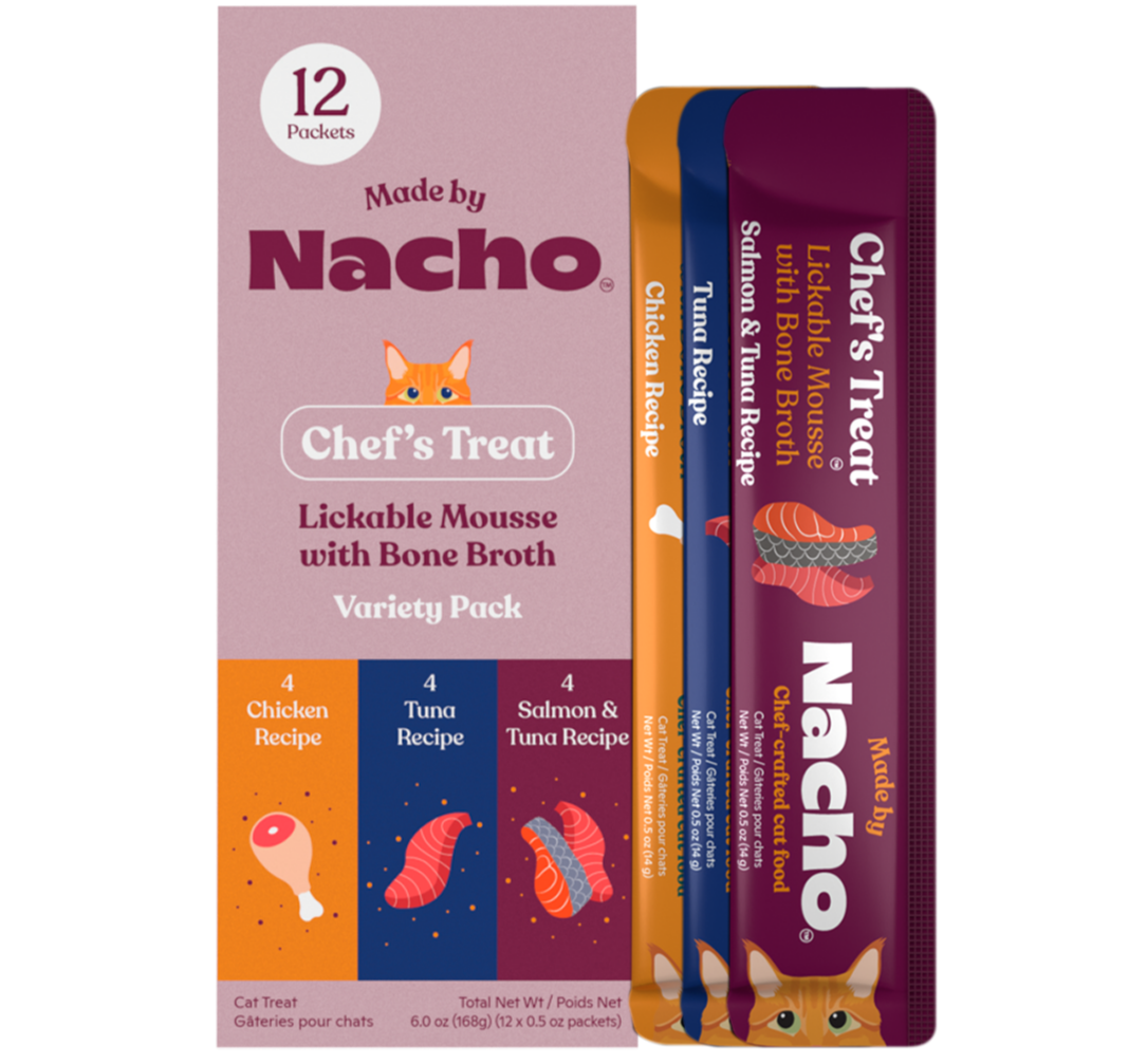 * Made by Nacho Lickable Mousse Variety Pack includes 12 chef-inspired cat treats you’ll reach for again and again * Choose from whipped bone broth with chicken, tuna, or salmon & tuna * Slow-simmered bone broth provides maximum hydration (and flavor!) * Lickable, light-as-air texture creates lot less mess * Serve on a tasting spoon or straight from the packet * Limited ingredients * No grains, corn, wheat, soy, artificial colors, flavors, or preservatives